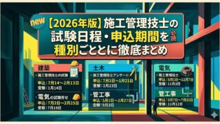 しごと 【2026年版】施工管理技士の試験日程・申込期間を種別ごとに徹底まとめ 2026年度の施工管理技士試験(建築・土木・電気・管工事)の日程・申込期間・受験資格をまとめました。試験日から逆算して今すぐ準備を始めましょう。 2026.04.01 しごと