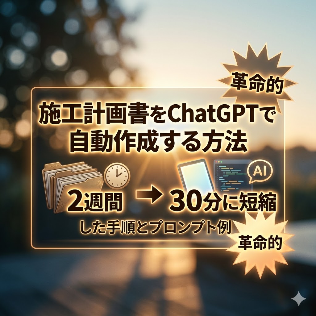 本記事では、施工管理歴18年の現場監督である私が実践している、ChatGPTを活用した施工計画書の自動作成方法を解説しました。かつて2週間かかっていた作業が30分に短縮できるなど、その効果は絶大です。